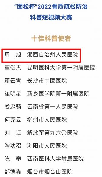 11月27日,由骨科在线主办的“固松杯”2022年骨质疏松防治科普短视频大赛全国总决赛在线上顺利举行,湘西州人民医院脊柱外科周旭作为全国前20强选手闯入总决赛,并斩获全国第一名。