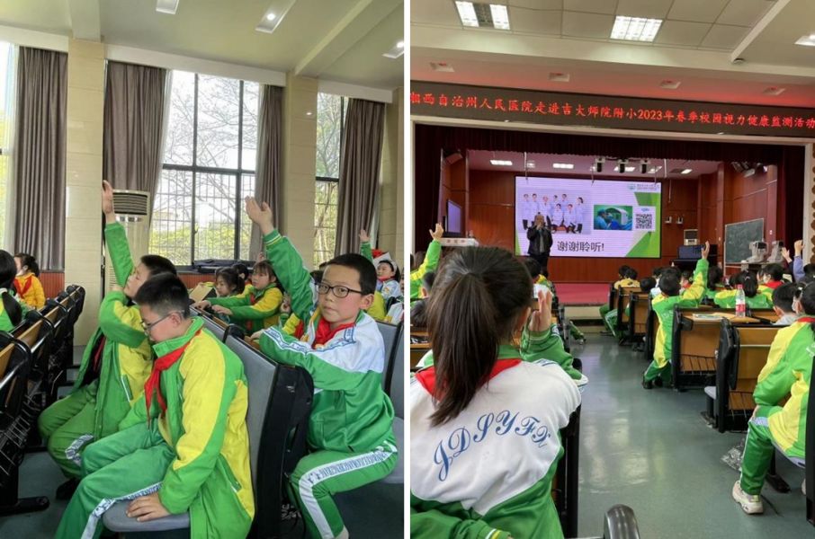 眼视光中心主任杨杰正在吉首大学师院附小为同学们进行“守护睛彩世界,点亮光明未来”科普知识讲座,活动开展现场答疑环节,同学们积极踊跃举手,现场气氛浓厚。