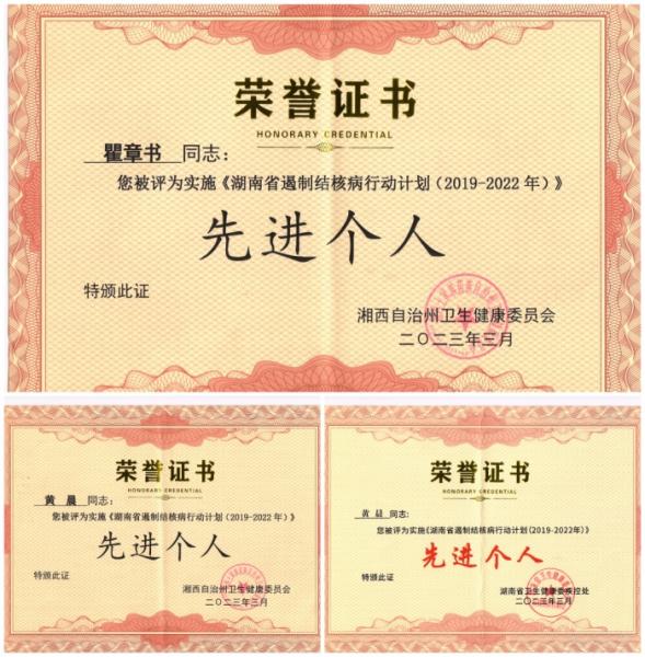 同时,我院感染科主任瞿章书荣获湘西州《湖南省遏制结核病行动计划(2019-2022年)》“先进个人”;黄晨荣获湖南省、湘西州《湖南省遏制结核病行动计划(2019-2022年)“先进个人”称号。